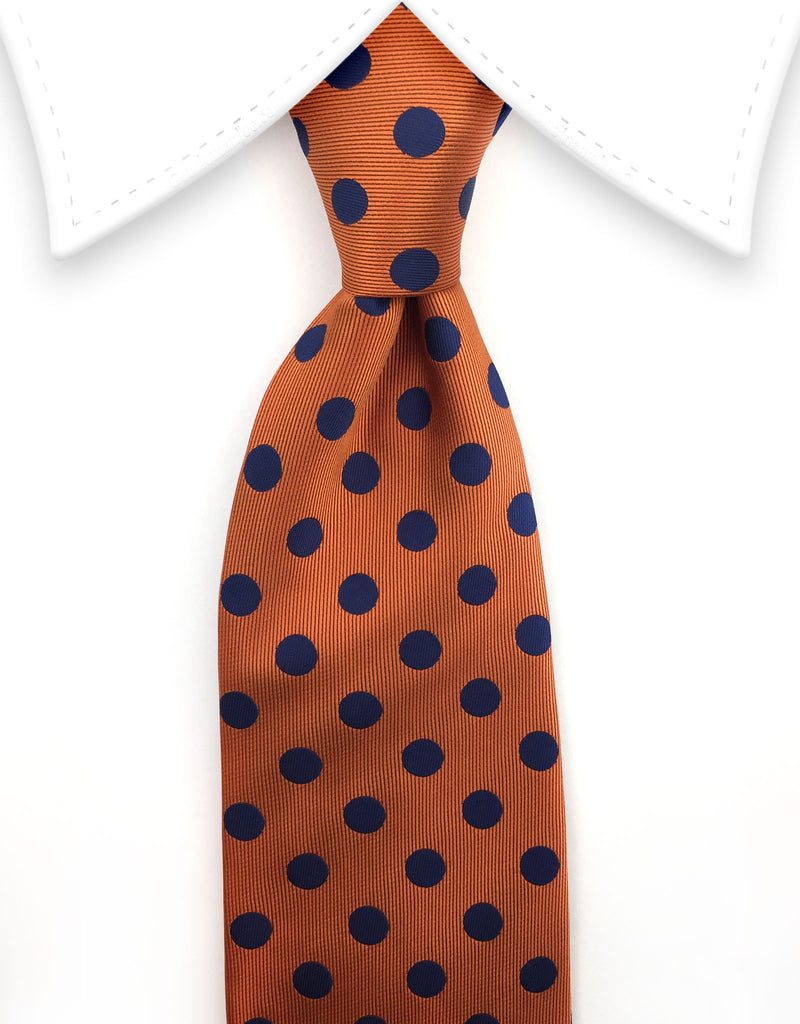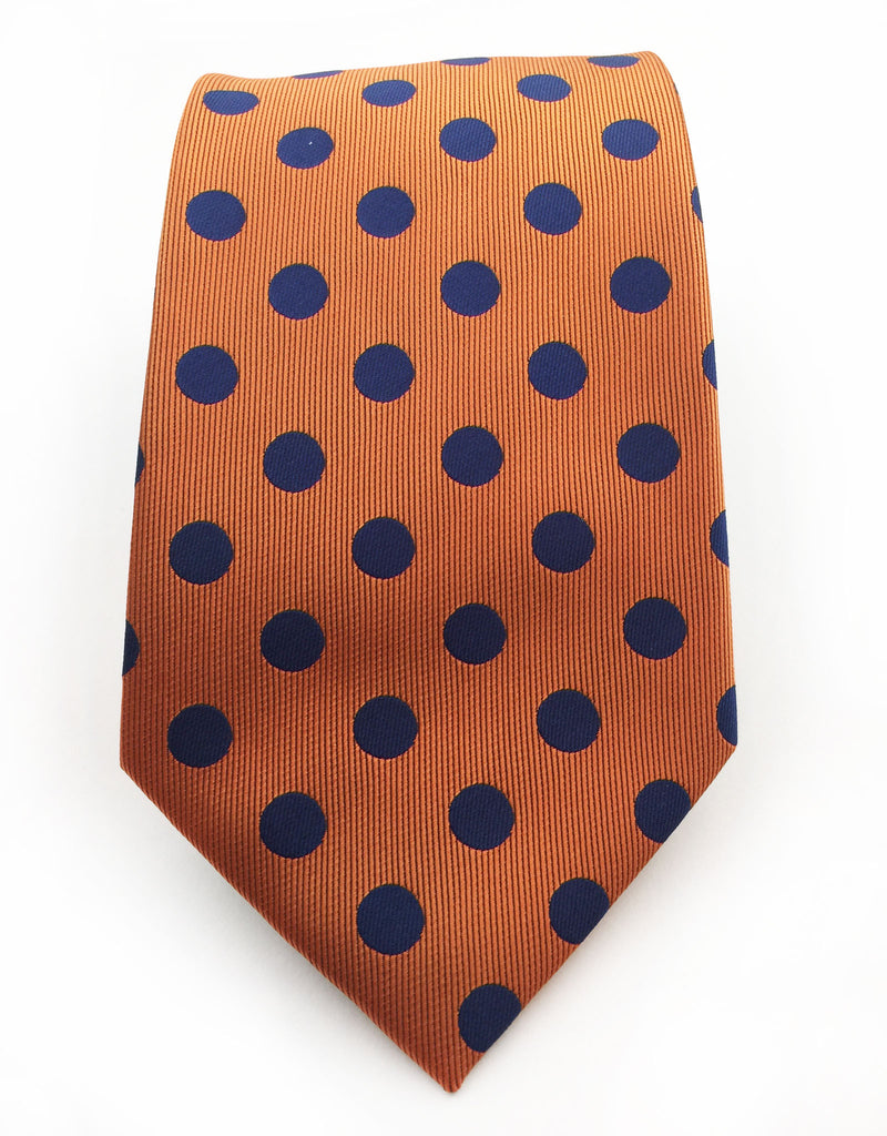 Another cool, classy accessory to add to your wardrobe. This orange & navy blue polka dot tie looks great at the office and great for casual wear. Put it on and get down to business or play!