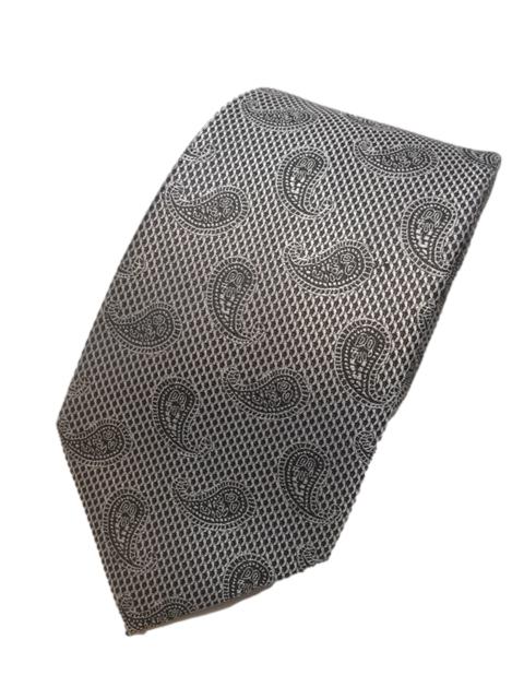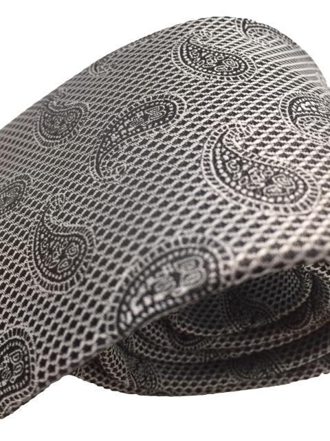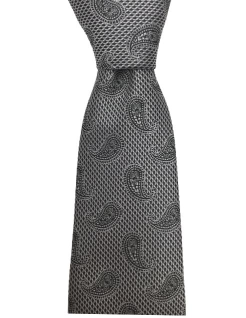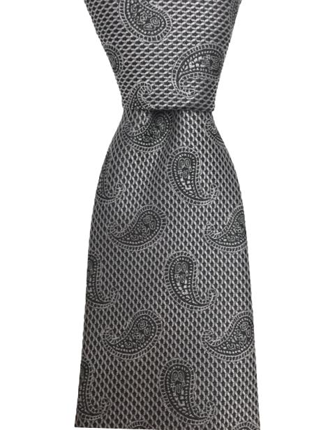 This is a sophisticated and elegant, silver and black necktie with small paisley prints. It's a favorite with all gentlemen.