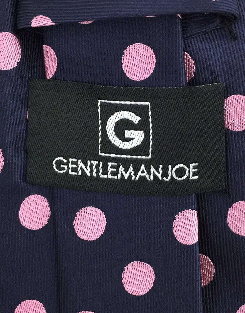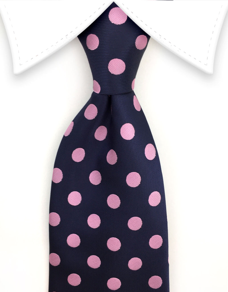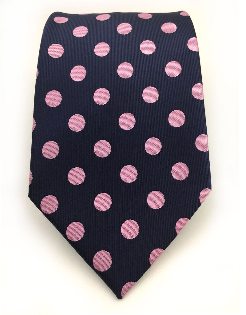 Another cool and fun necktie to add to your wardrobe. This navy blue and pink polka dot tie looks great at the office and great for casual wear. Put it on and get down to business or play!