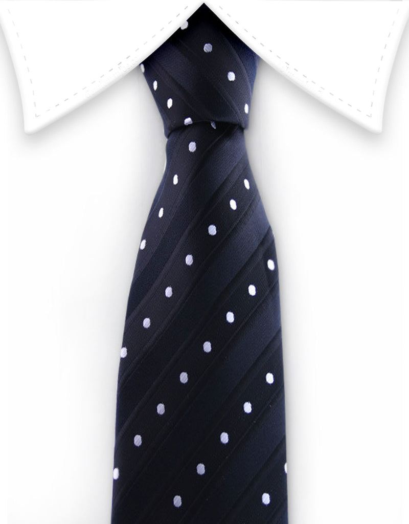 This fun loving black with white polka dot, skinny necktie will look smart and playful, all at the same time. Choose it when you wanna have some fun!