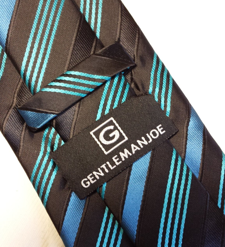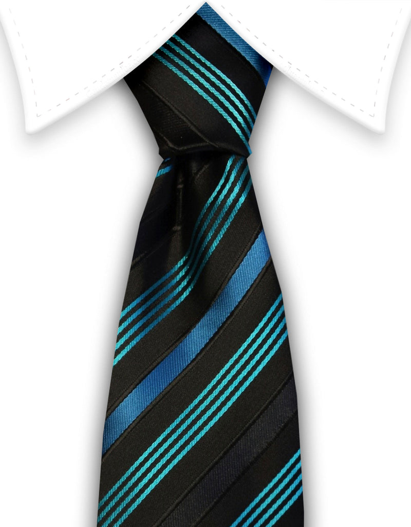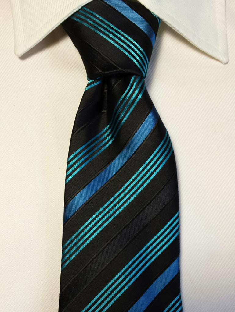 Here's a bright and racy combination of turquoise, teal & black stripes! You'll stand out and look like a real urban gentleman when wearing this necktie.